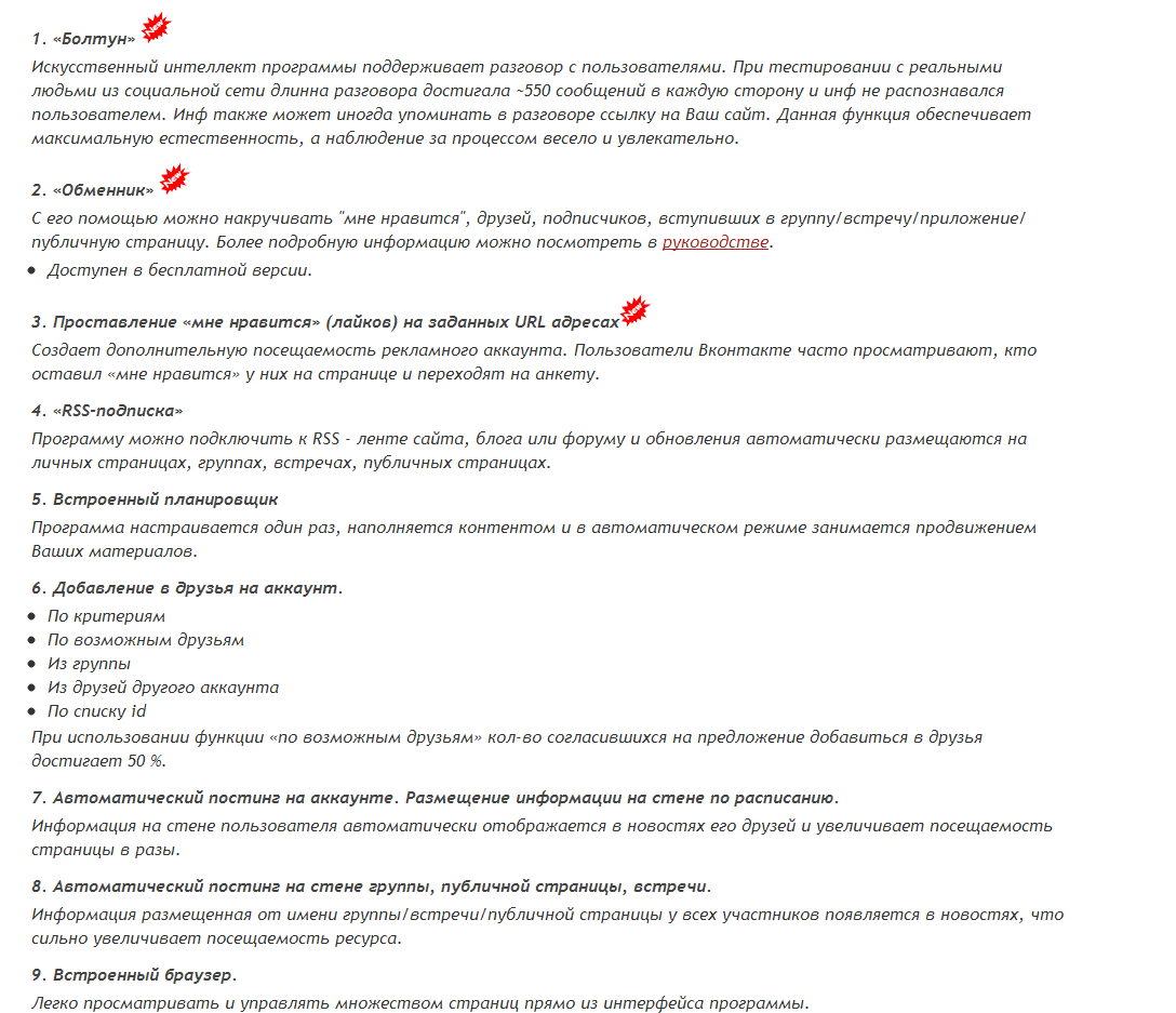 Да, Ботовод платный, но согласитесь, что 1950 рублей (или около того, ведь цены могут поменяться) — это не деньги, когда на кону продвижение ВКонтакте, популярность группы и внимание целевой аудитории. Тем более, что при сотрудничестве с теми проектами, о которых я писал выше, платить придется постоянно: 1000 рублей за 1000 пользователей или 3 000 за 10 000 — это не так важно — главное, что если вам понадобятся новые участники, придется опять отдавать за них деньги. А Ботовода нужно будет купить всего один раз, и потом с его помощью вы сможете хоть 10 000 раз привлекать по 10 человек, хоть 10 раз по 10 000, ничего не доплачивая. Кстати, вот преимущества программы:
