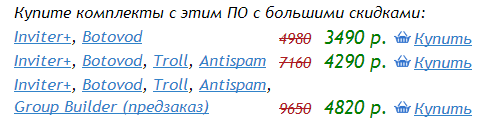Но сразу оговорюсь, это уже обновленные и расширенные версии программы (как вы можете видеть, даже в пакет «Базовый» входит не только Ботовод). Так что не удивляйтесь ценам, а лучше воспользуйтесь скидкой, пока она еще существует.