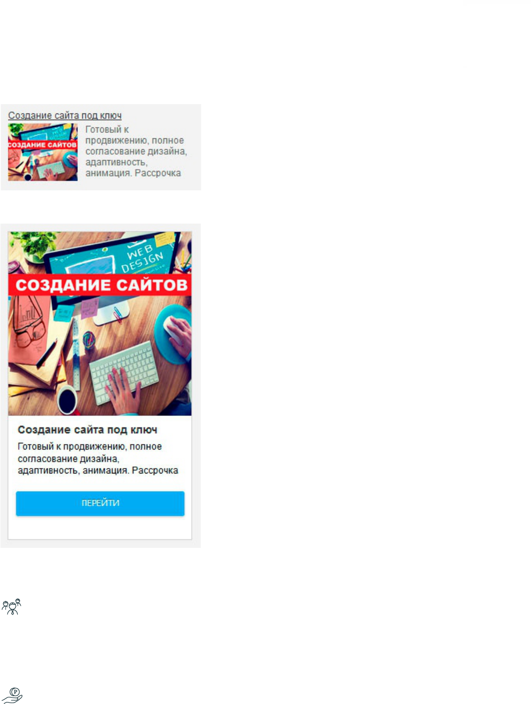 также можно добавлять кнопки: перейти, купить,